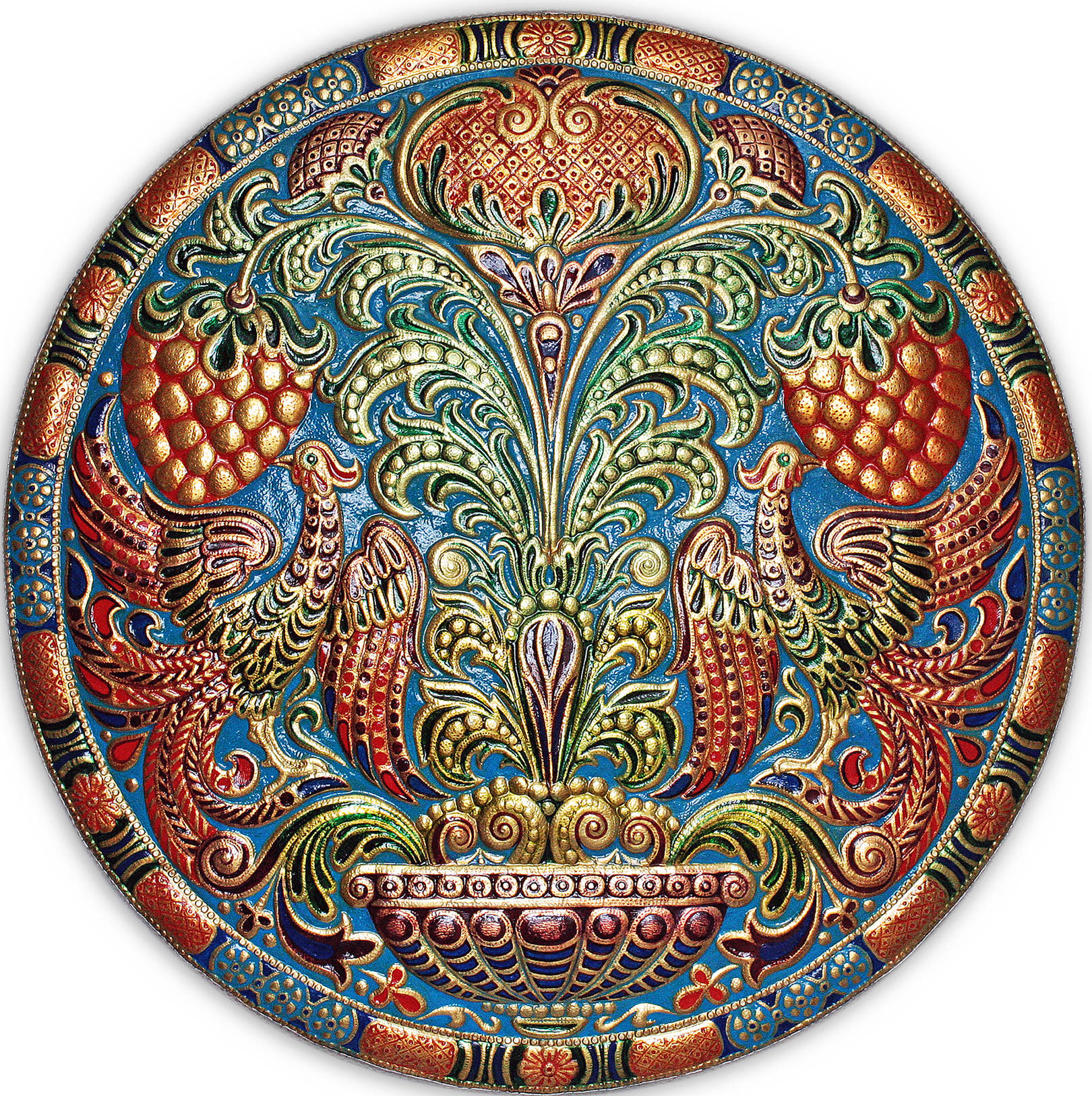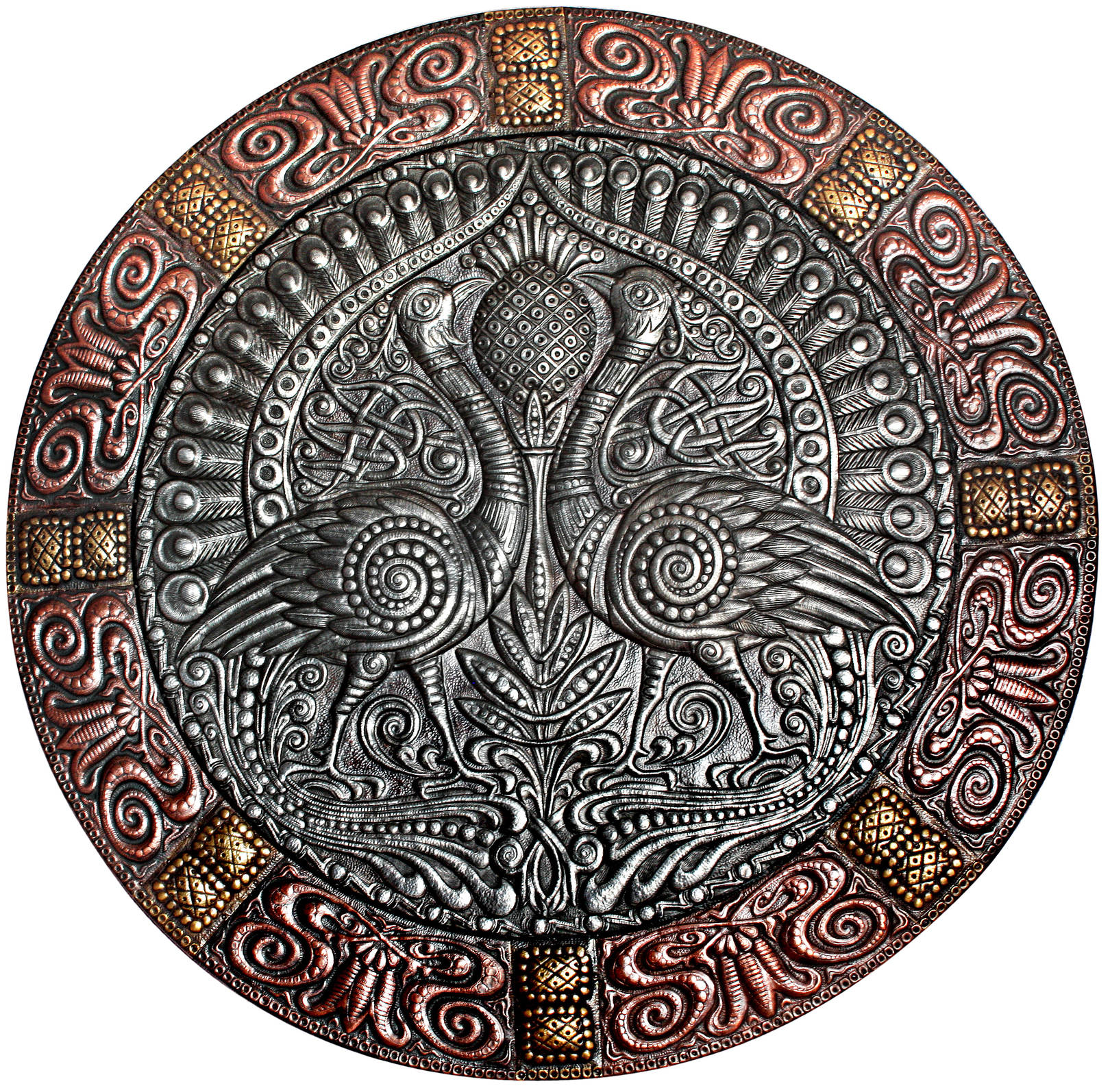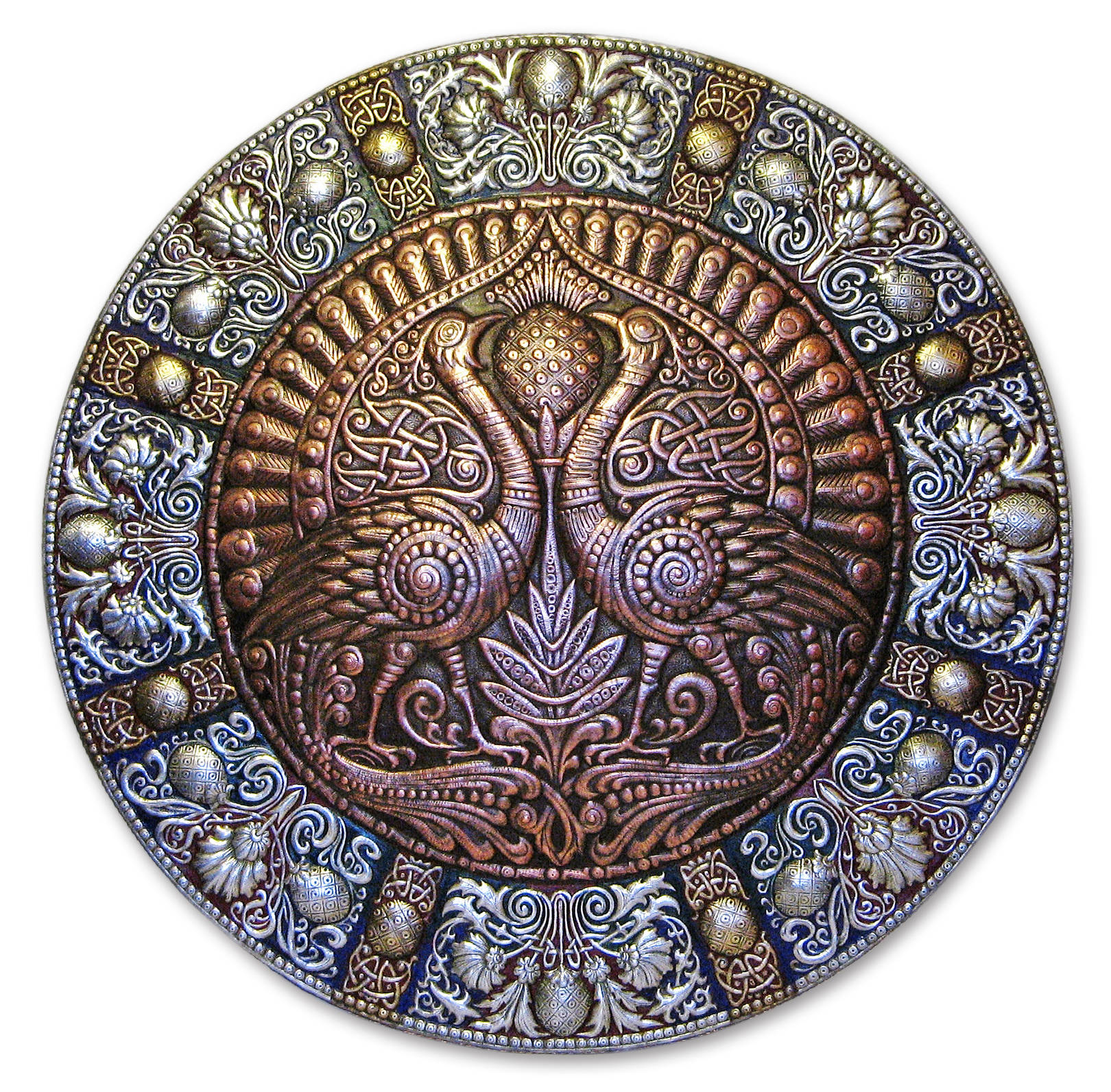 Павлины (панно-рондо) 2008 г. Алюминий, медь, латунь; чернение, холодная эмаль 90 х 90 см