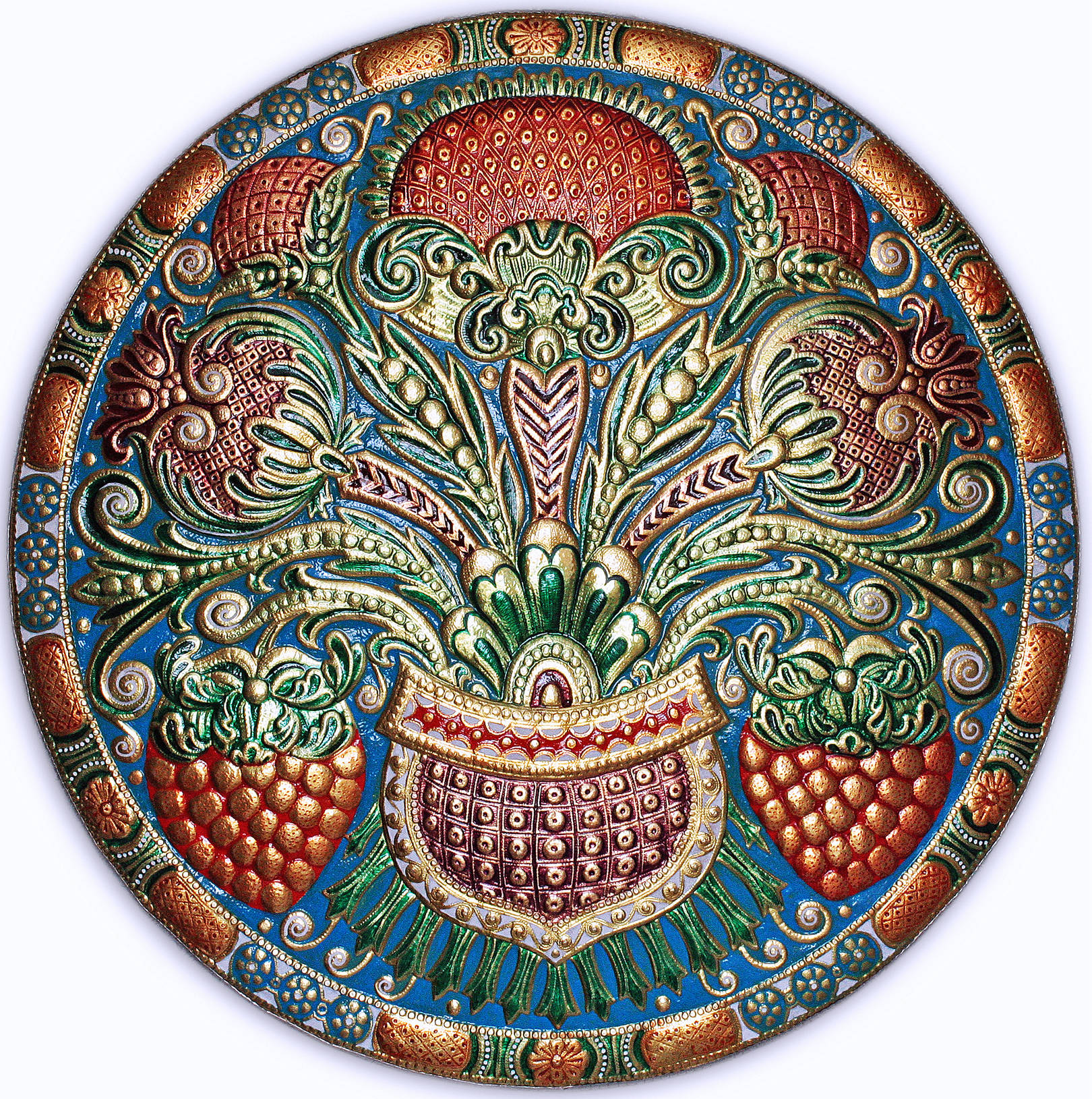 Ягоды и цветы (панно-рондо) 2008 г. Анодированный алюминий; холодная эмаль 70 х 70 см