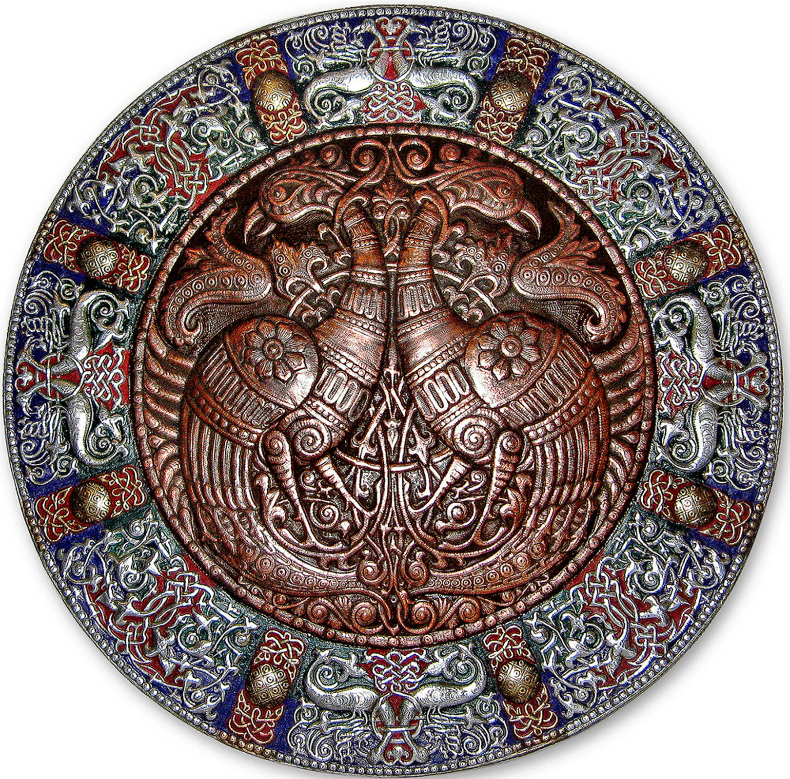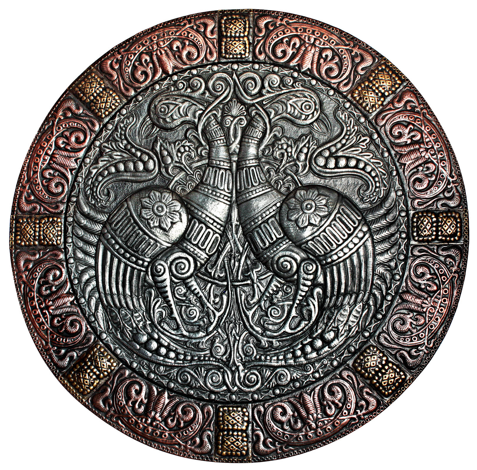 Волшебные птицы (фрагмент панно-рондо) 2008 г. Алюминий, медь, латунь; чернение, холодная эмаль 90 х 90 см