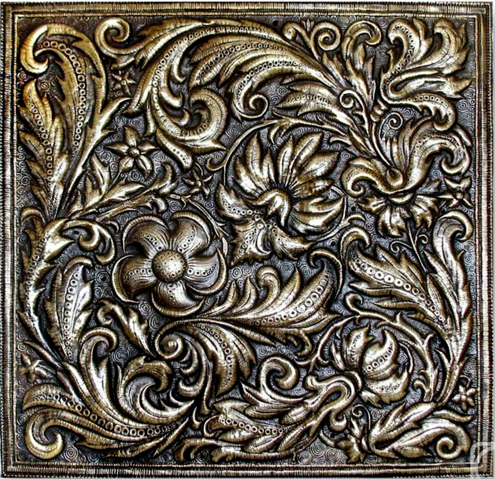 - Рельефной. Ее также относят к категории сложных видов. Работу начинают с выколачивания контуров рисунка, затем изображение делают рельефным. На завершающем этапе выравнивают детали изображения и полируют.