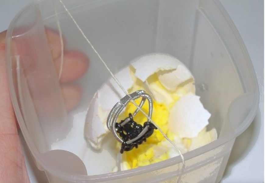 - Желтки положить на дно контейнера, серебряное изделие подвесить на нитку, закрепить на крышке контейнера и плотно закрыть. Украшение должно болтаться внутри контейнера, периодически его нужно поворачивать, чтобы чернота образовывалась равномерно.