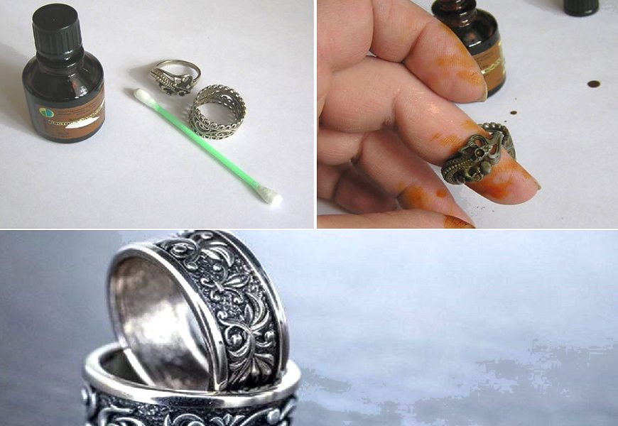 Йод, который имеется в аптечке каждой хозяйки, также является отличным средством для чернения драгметалла. Для начала серебряные серёжки или кольца нужно очистить от отпечатков пальцев, потожировых следов, загрязнений. Затем при помощи ватной палочки или тампона украшение нужно тщательно промазать йодом и оставить сушиться на солнечных лучах.