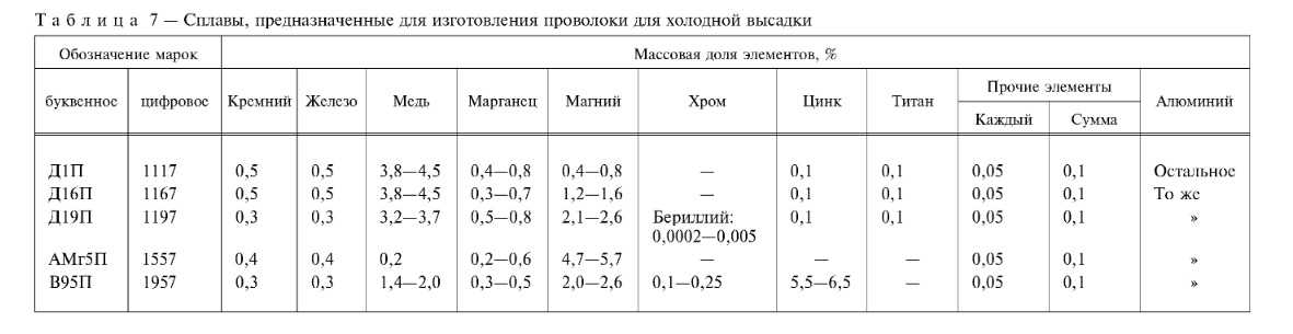 Всего насчитывается 8 таблиц ГОСТ 4784-97. Среди них есть марка дюраль д16, которая несколько раз появляется в них. Один раз просто, второй – с пометкой «П», что означает предназначенность материала для изготовления проволоки холодной высадки.