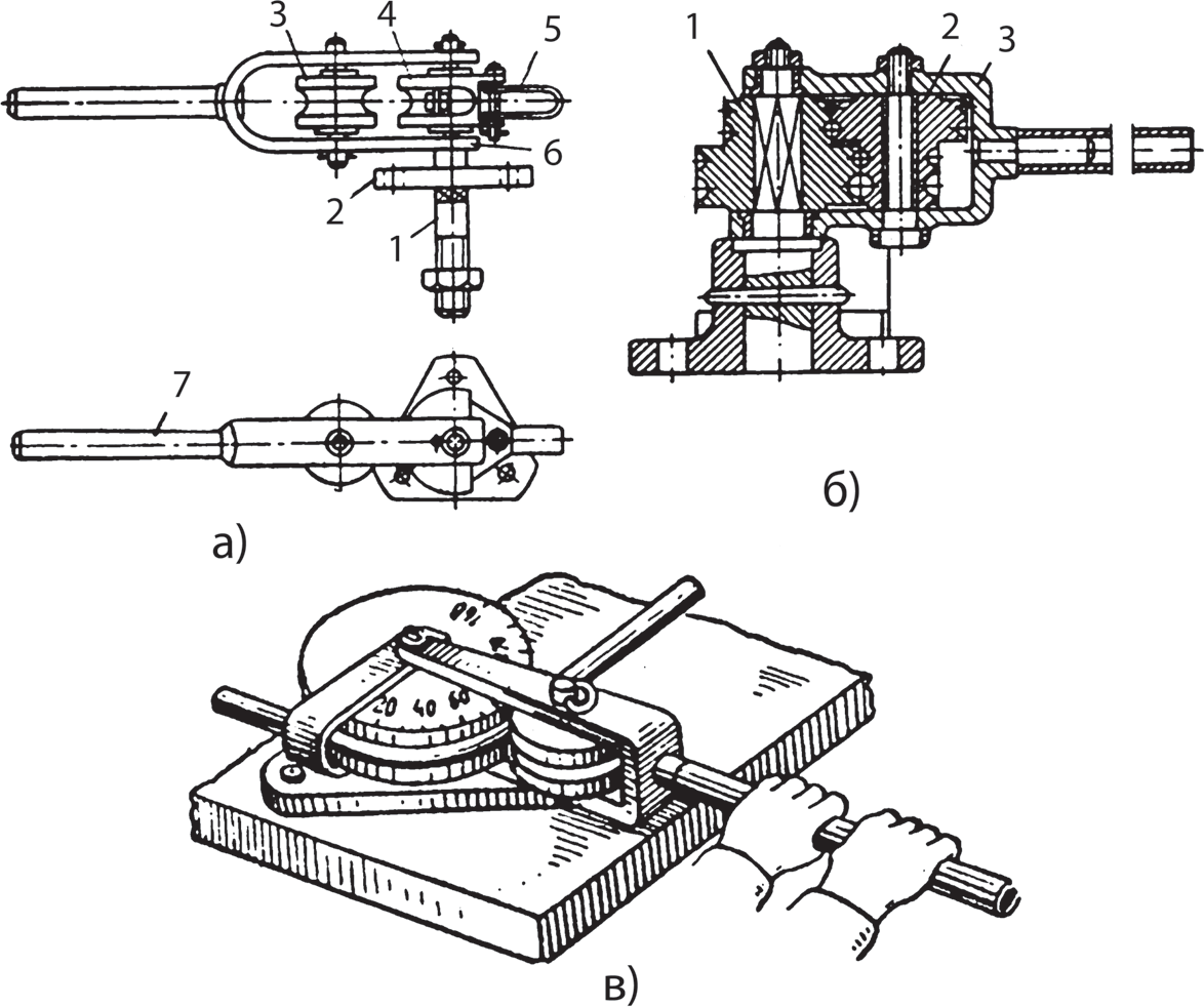На рис. 4, а показан ручной станок, предназначенный для гибки труб диаметром от 12 до 20 мм. Станок имеет ось 1 и опорную плиту 2, с помощью которых он крепится болтами к верстаку. Рабочими органами станка являются неподвижный ролик 4 с хомутиком 5, укрепленный на оси 1, и подвижный ролик 3, закрепленный на скобе 6 с рукояткой 7. Изгибаемую трубу концом закладывают в хомутик между роликами, затем вращают скобу с подвижным роликом вокруг оси неподвижного ролика до получения требуемого изгиба, после чего возвращают скобу в исходное положение и вынимают трубу.