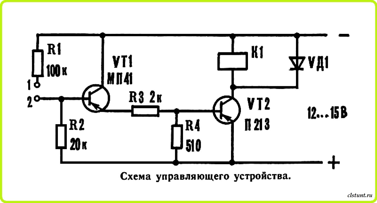 Наладка терморегулятора: если при закорачивании точек 1—2 реле не срабатывает, соединяют эмиттер и коллектор VТ1. Включение реле указывает на неисправность или малый коэффициент усиления VТ1, В противном случае неисправен транзистор VТ2 или он имеет недостаточный коэффициент усиления.