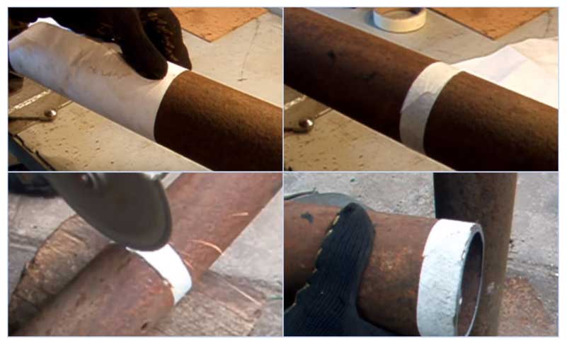 Для разметки разреза под прямым углом можно воспользоваться листом бумаги стандартного формата А4, широкой изолентой или строительным скотчем. Если обернуть достаточно широкий материал вокруг трубы так, чтобы его края точно совпали при наложении, то получится идеальная линия реза. Если скотч или лента плотно приклеились к металлу, можно идти прямо по краю.