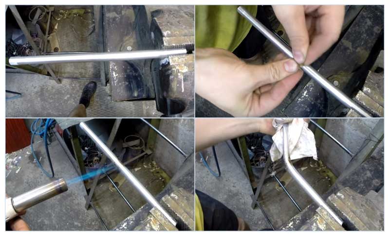 Затем вставляем трубу меньшего диаметра в большую, помещаем ее согнутым местом поближе к краю отрезка, нагреваем с помощью паяльной лампы либо газовой горелки и постепенно, плавно отжимаем в обратную от изгиба сторону, придавая необходимую форму.