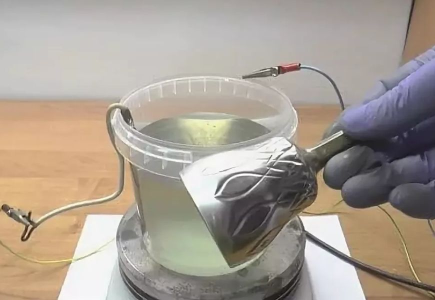 Компоненты тщательно перемешиваются. А затем их требуется нагреть до температуры 70−80 градусов. Закладывают в жидкость необходимые предметы и выдерживают их там в течение четверти часа. После проведения обработки металлическая поверхность становится серебряной и приобретает характерный блеск.