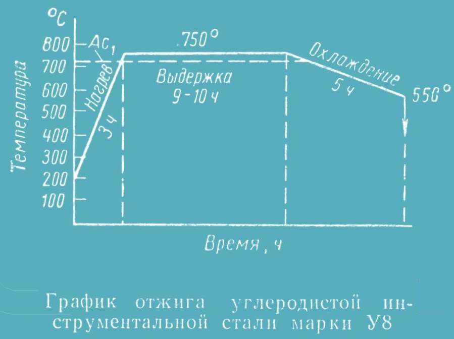 Для снятия наклёпа холоднодеформированных изделий из стали У8 их подвергают рекристаллизационному отжигу с охлаждением в расплавах солей (для мелкого инструмента), и в водном растворе поваренной соли – для более крупного. В результате улучшается механическая обрабатываемость, снижаются остаточные деформации (особенно для длинных и тонких прутков и полос), а также оптимизируется структура стали. Температура такого вида отжига составляет 670…700 °С пр выдержке в печи не более часа. При отжиге происходит полная перекристаллизация металла структура получается мелкозернистой, при равномерном распределении зёрен перлита. После отжига твёрдость стали У8 должна быть не более 190 НВ.