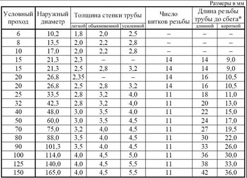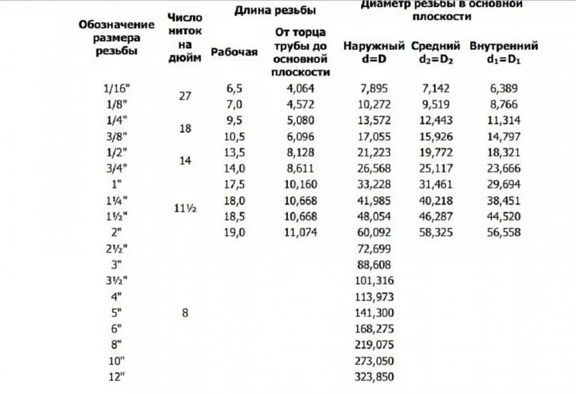 Для полного ознакомления соотношения диаметра и резьбы дюймовых и миллиметровых труб приводим сравнительную таблицу. Воспользовавшись её содержанием, вы сможете самостоятельно определить размер резьбы, шага и номинального значения наружного, среднего и внутреннего диаметра.