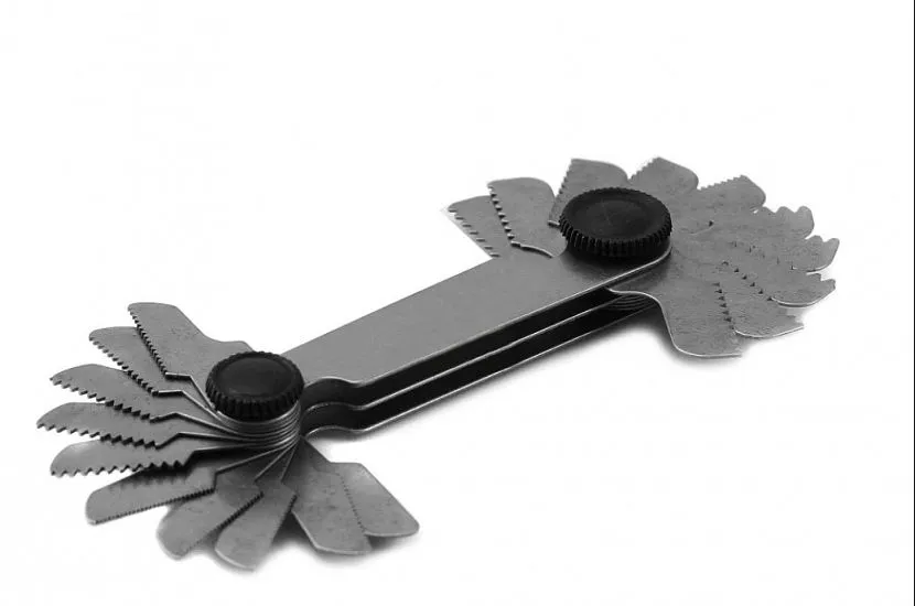 Это специальное приспособление, предназначенное для определения шага нарезанной резьбы. Устройство инструмента построено по принципу корпуса, к которому присоединено несколько щупов (тонкие пластины с гребёнкой). Форма каждой из них схожа с конкретным размером нарезанного шага.