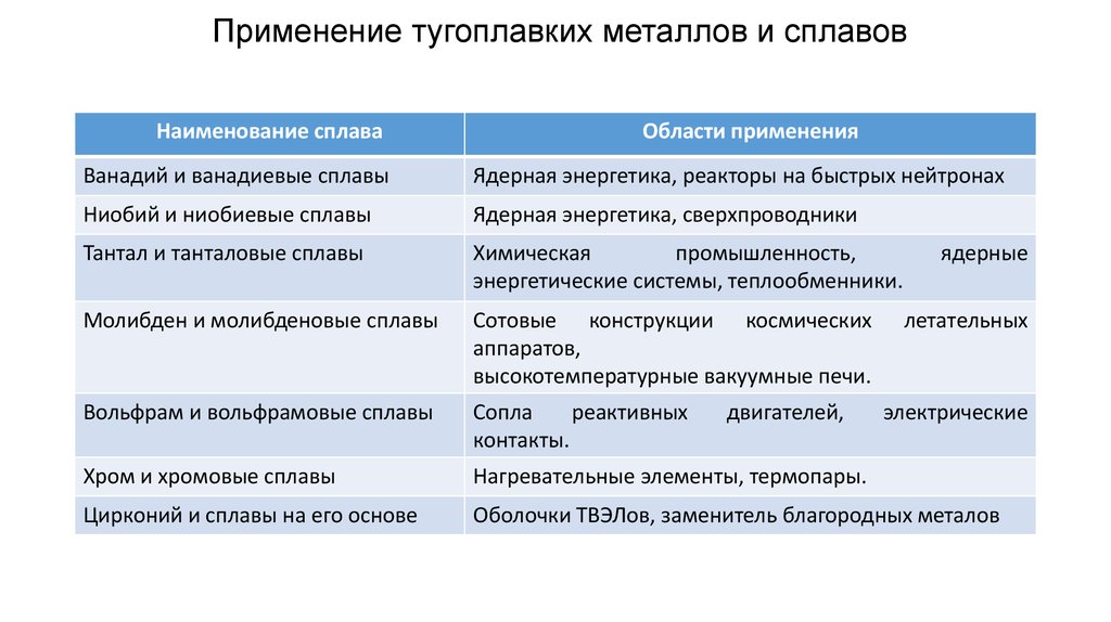В зависимости от температуры плавления тугоплавкие металлы причисляются к основной либо дополнительной группе.