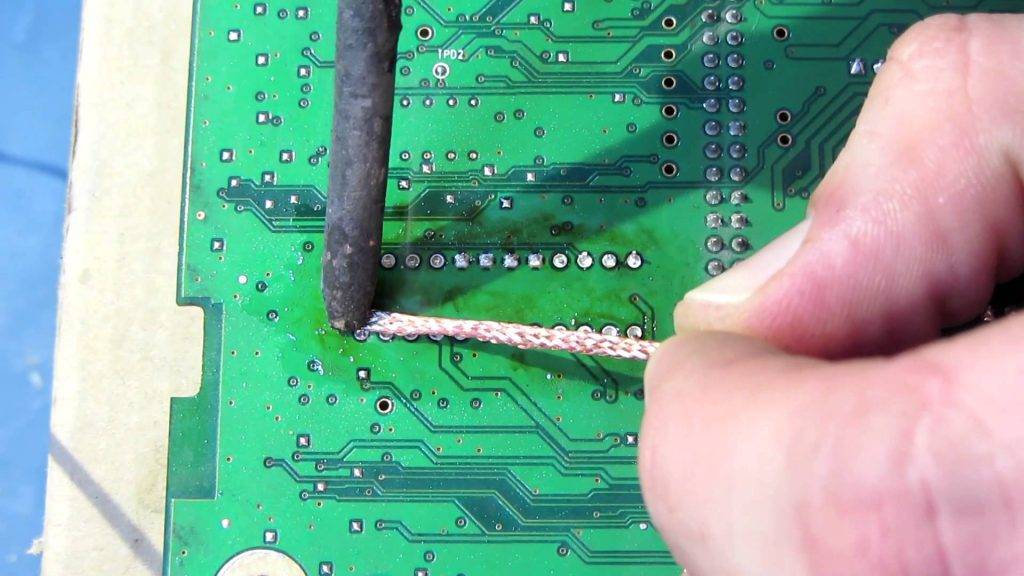 После того, как удалена старая микросхема, настаёт черед установки новой. Сначала необходимо подготовить место, убрать лишний припой при помощи паяльника и медной оплетки.