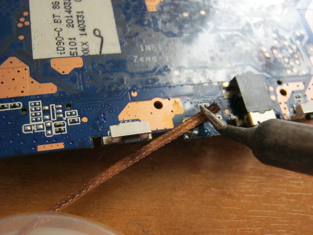 Если контактные площадки были сорваны или перегреты во время процедуры замены, то можно их восстановиться при помощи тонких проволок. Для этого необходимо найти контрольные точки на плате или дорожки и к ним подпаять проволоку. В качестве проволоки можно использовать оплетку от коаксиального кабеля мобильного устройства или катушку со сломанного динамика