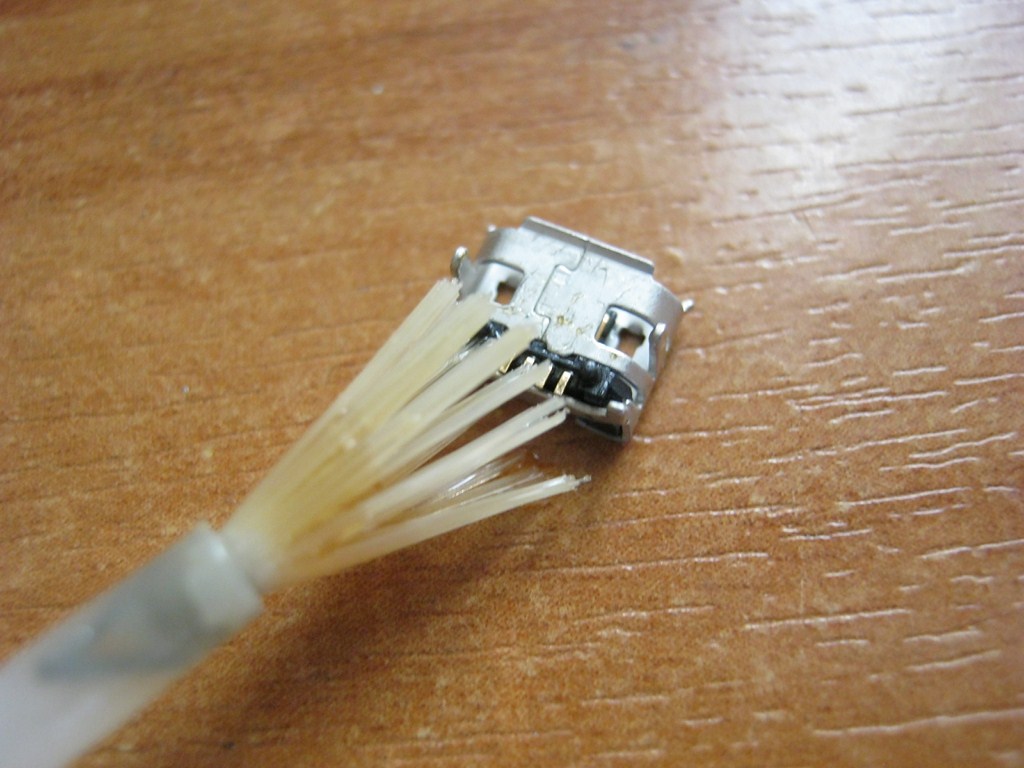 Кабель Micro-USB имеет соединители с 5 контактными площадками. К ним подводится отдельный монтажный провод в изоляции нужного цвета. Чтобы штекер точно и плотно садился в гнездо, верхняя экранирующая часть имеет специальную фаску. Контакты микро-USB пронумерованы цифрами от 1 до 5 и читаются справа налево.