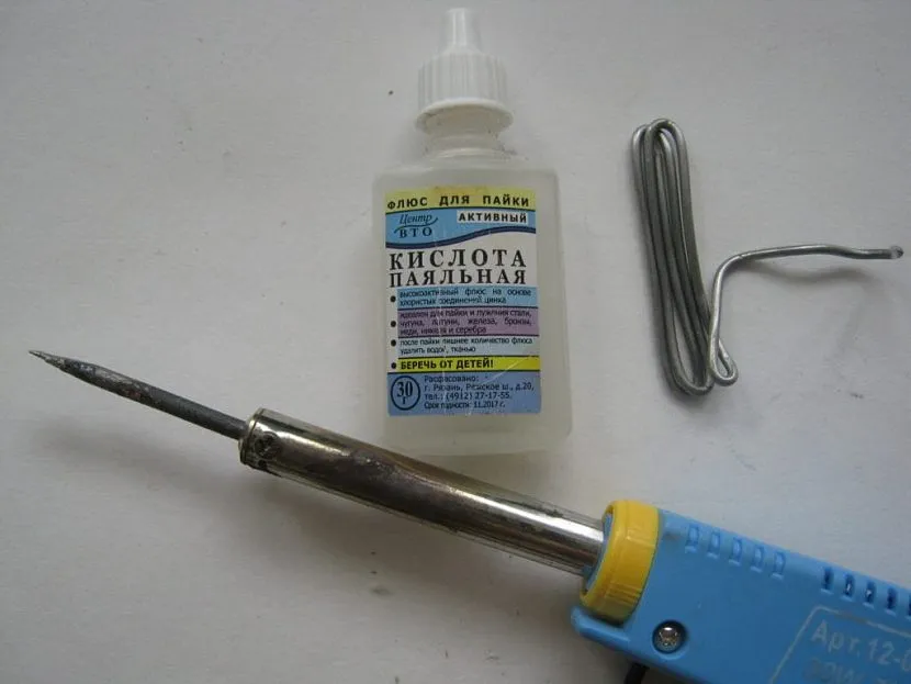 Паяльная кислота, или флюс необходима для подготовки контактов к спаиванию. Новичку следует знать, что флюс для каждого спаиваемого материала отличается, и нельзя применять кислоту для пайки алюминия на медном проводе, иначе припой просто не ляжет.