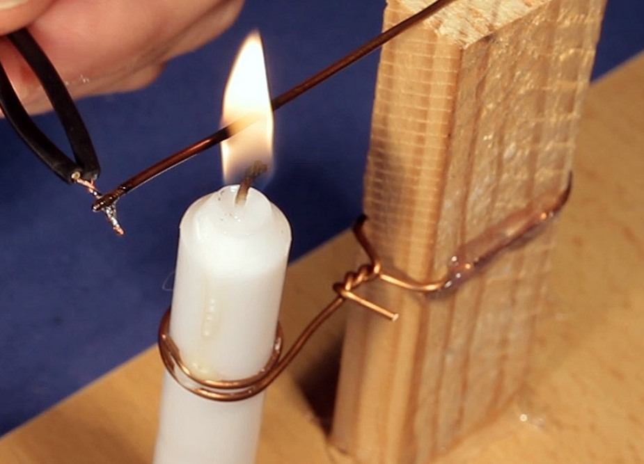 В местах, где отсутствует электричество, можно использовать самодельный аналог паяльника. Для этого необходимо найти медный стержень (провод) диаметром 4-5 мм и длиной порядка 10 см. Один конец стержня стачивается в виде отвертки, а другой — закрепляется в деревянной ручке. Такую ручку круглой формы легко вырезать из ветки дерева. Нагрев такого элементарного паяльника производится от открытого пламени. Сам процесс пайки мало чем отличается от пайки электрическим паяльником. Надо только приспособить термостойкую подставку, в которую устанавливается устройство при нагревании. Установка должна производиться быстро — одним движением руки. Припой и канифоль должны находиться в плоской емкости. Сама пайка провода или других деталей производится в непосредственной близости от источника нагрева.