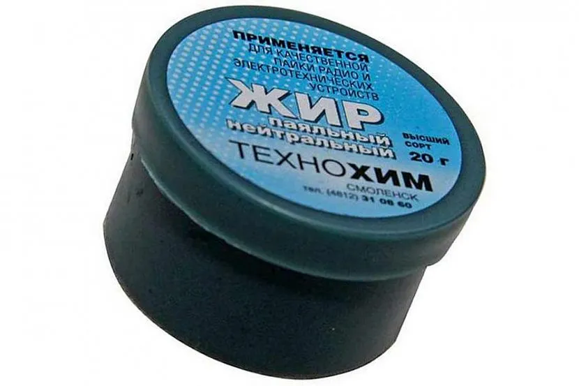 На седьмом месте расплылся паяльный жир, он бывает активный и нейтральный, состав: канифоль, вазелин, парафин или стеарин, хлорид цинка, деионизованная вода и хлорид аммония. Вся эта ядреная смесь очень хорошо справляется с сильно-загрязненными поверхностями металла. Как раз для этого и нужен парафин. Он как бы приподнимает всю грязь наверх, подальше от эпицентра пайки.