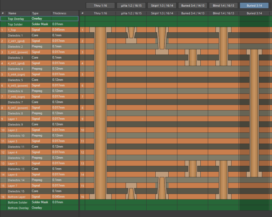 В менеджере слоев Layer Stack Manager, входящем в состав Altium Designer, о котором упоминалось в первой части данного цикла статей, имеется возможность создавать все типы переходных отверстий, существующих в настоящее время (см. Рисунок 9).