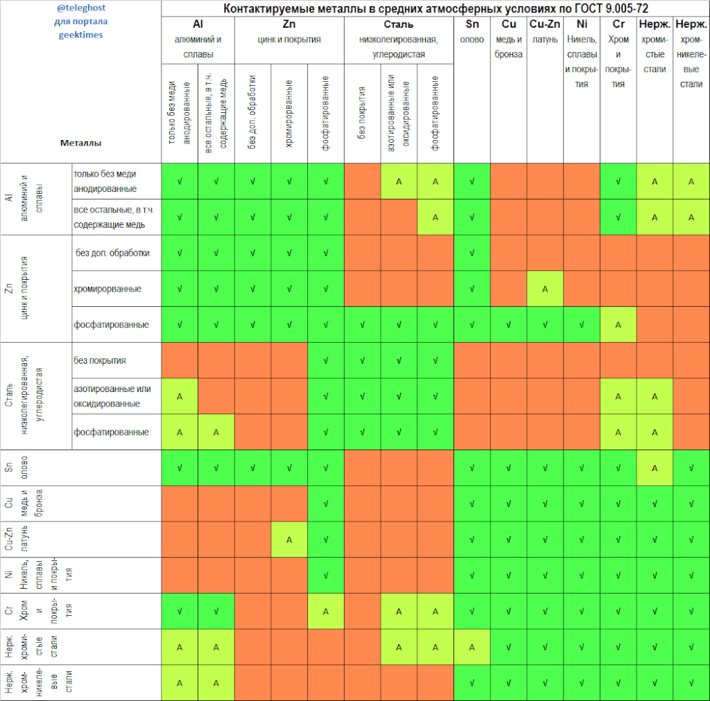 Буква «А» в таблице совместимости означает «ограниченно допустимый в атмосферных условиях».