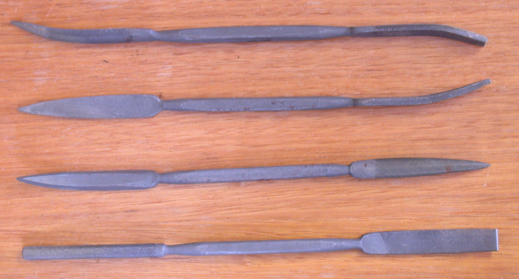 Самая многочисленная группа – надфили, бывают 11 типов: круглые, квадратные, овальные, плоские, полукруглые, трехгранные, ножовочные и т. д. Характеризуются они небольшой длиной бруска и насечками 5 класса. Чаще всего оснащаются они двойной насечкой. Используют такой напильник для обработки мелких деталей или таких мест, куда не добраться обыкновенными слесарными инструментами.