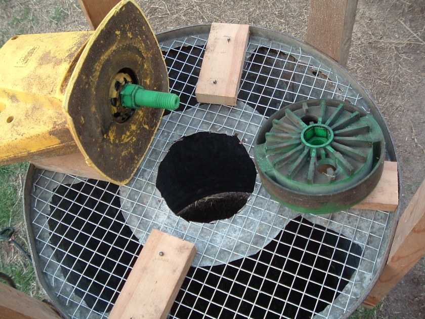 Если используемый для сборки шредера триммер оснащен бензиновым двигателем, то мотор располагают на основе так, чтобы можно было удобно заливать топливо, заводить устройство и регулировать его работу (обороты).