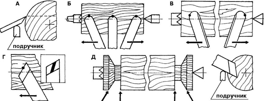 Примеры основных работ ручным инструментом при деревообработке: А — черновое точение; Б,В — первый проход; Г- срезание стружки; Д — торцовка детали