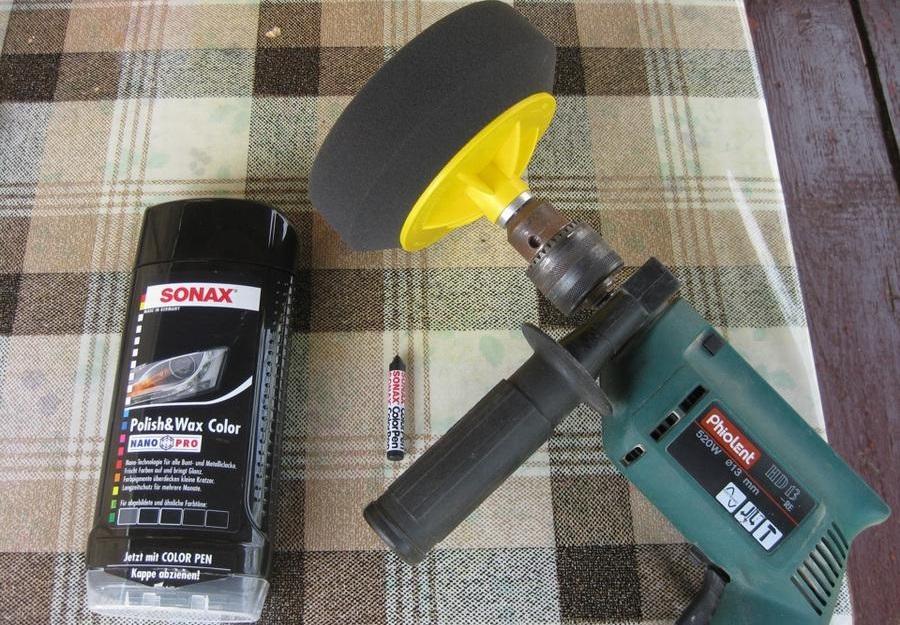 Изначально нужно царапины зачистить наждачной бумагой, затем в зависимости от степени нанесенных повреждений, выбрать подходящие материалы и инструмент, входящие в набор для полировки: насадки, дрель, абразивные пасты, включая различные по типам. Как показано в этом уроке, отображенном в видео: