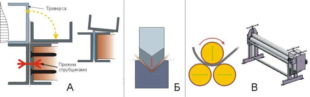 - гибку роликовым инструментом, которую часто совмещают с профилированием непрерывного листового материала и отрезкой ножами. такая гибка носит локальный характер. усилие при этом незначительно, что позволяет вести процесс на автоматизированном оборудовании повышенной производительности.