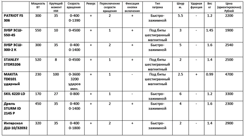 Ниже предоставлена таблица с характеристиками некоторых шуруповертов, в том числе максимальный крутящий момент: