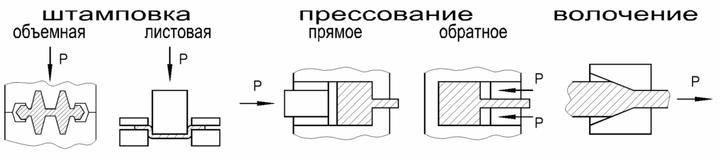 - Прессование — на этом этапе происходит повышение плотности металлической заготовки и изменение ее формы, за счет высокого давления. Прессование может быть прямым и обратным. При прямом способе происходит выдавливание металлических заготовок через различные отверстия, что приводит к получению различных прутьев, труб и профилей. При обратном прессовании металлические изделия располагают в специальном формуляре, при этом давление подается в обратном направлении.