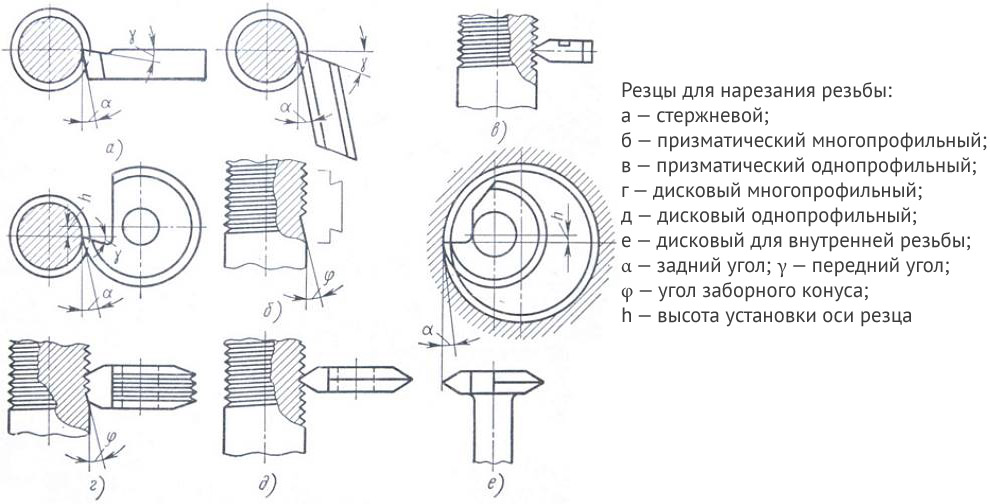 На практике применяются резцы для наружной и внутренней резьбы с державкой прямоугольного сечения. Реже встречаются дисковые, призматические, затачиваемые по передней поверхности. Рабочий профиль у всех соответствует размерам винтовой канавки. По направлению нарезаемой спирали выпускают левые и правые.