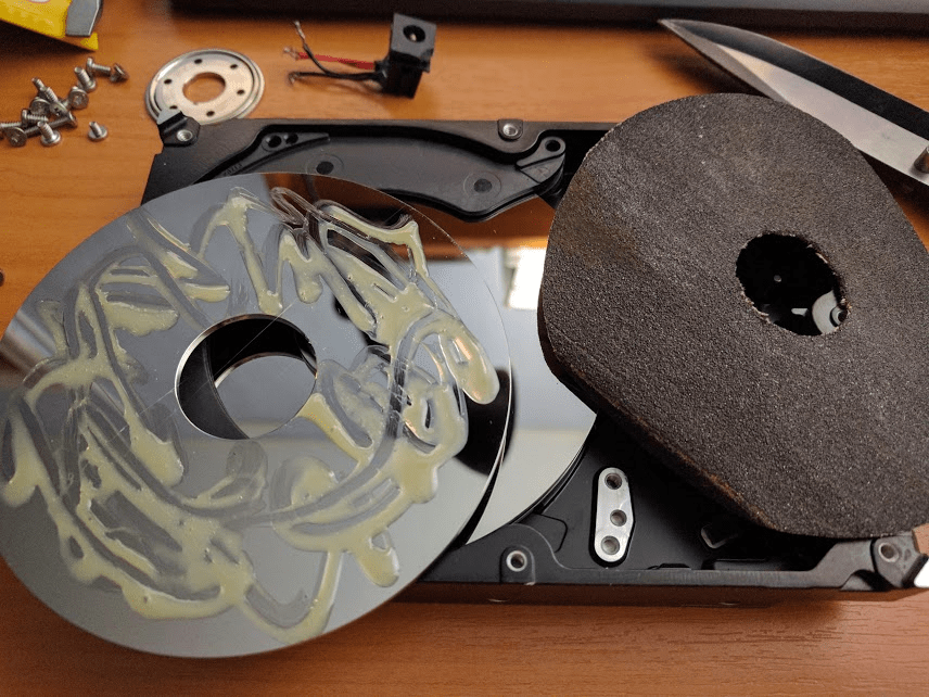 Разберите винчестер и снимите с него блины. Имейте в виду, что один или несколько винтов обычно спрятаны под наклейкой — если не найти и не открутить их, снять крышку не получится. Уберите все лишние компоненты (считыватель и т.п.), оставьте только логическую плату, мотор и шпиндель. Блины не выкидывайте, они понадобятся. Положите один блин на наждачную бумагу, обведите его и вырежьте из бумаги круг с отверстием посередине.