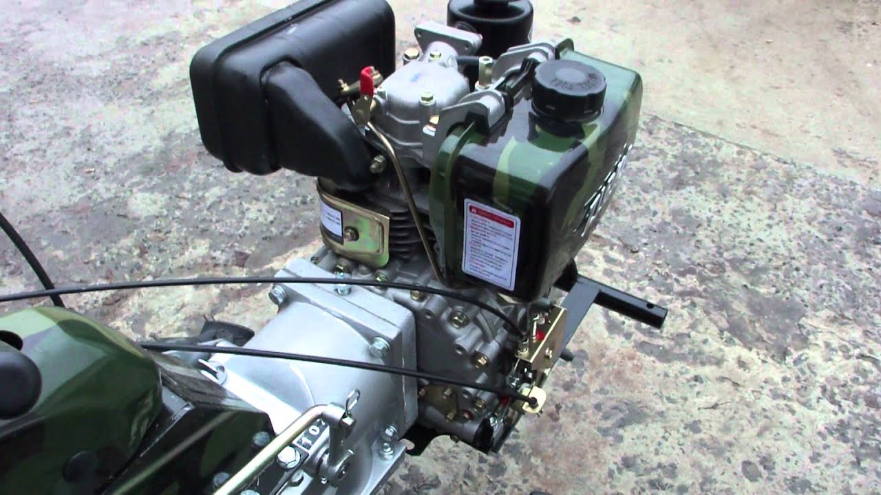 Дизельные виды машин требуют иного подхода. В первую очередь следует стравить воздух из топливных шлангов. Чтобы выполнить эту задачу, открывается краник, после чего откручивается соединение для подачи ДТ до самой форсунки. Необходимо дождаться, чтобы начала течь солярка. Дальше открываются краны, рукоять газа переводится на среднюю позицию. Нужно 3-4 раза выжать рычаг и покачать декомпрессор (удерживая пальцем). Затем его нужно вернуть в начальную позицию. После выполнения этих манипуляций однократно нажать и дёрнуть стартер. При выполнении всех перечисленных этапов мотоблок должен завестись.