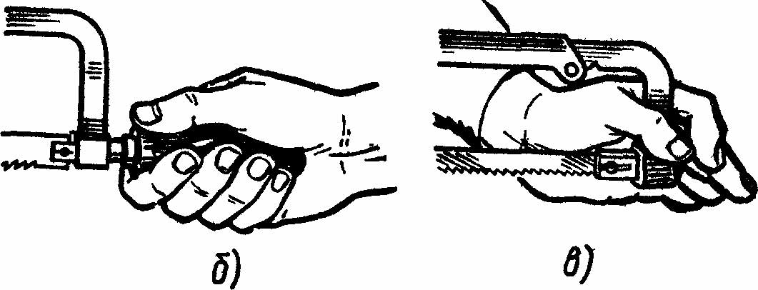 а) рукоятку ножовки захватывают пальцами правой руки (большой палец накладывают сверху, остальные пальцы поддерживают рукоятку снизу), конец ручки упирают в ладонь (рис. б). Не следует вытягивать указательный палец вдоль ручки и глубоко захватывать рукоятку, так как конец ее будет выходить из кисти, что может привести при работе к травме руки
