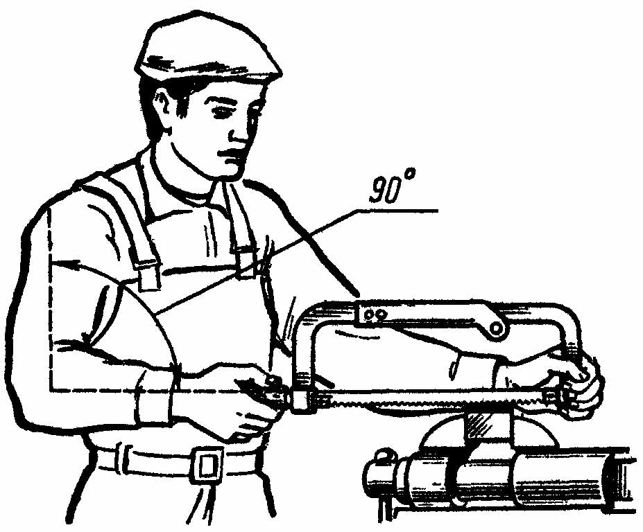 г) при резании соблюдать следующие правила: в работе должно участвовать не менее 3/4 ножовочного полотна; делать 40—50 рабочих движений в минуту; нажим на ножовку делать только при движении вперед; заканчивая разрезание, поддерживать отрезаемый кусок рукой.
