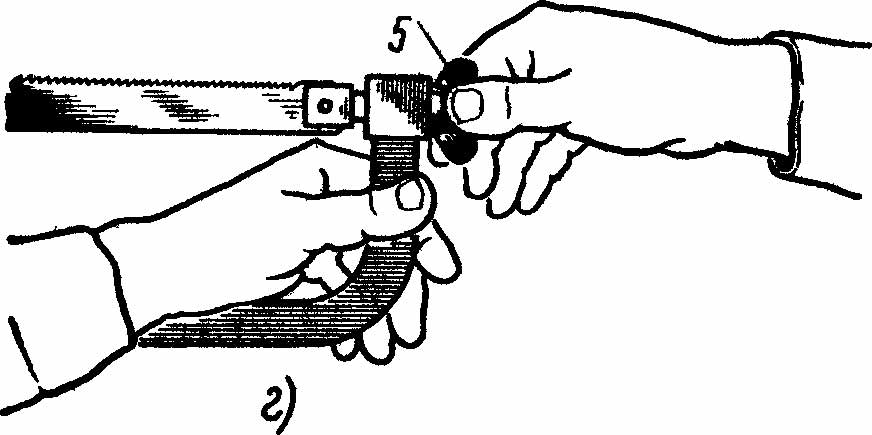 б) левой рукой держать рамку ножовки, как показано на рис. — в. Четырьмя пальцами охватывать барашек и натяжной болт, а не одну только рамку; если делать иначе, будет тяжело устранить покачивание ножовки во время работы.