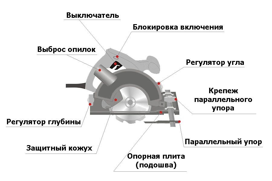 Конструкция ручной дисковой пилы включает в себя следующие обязательные элементы: