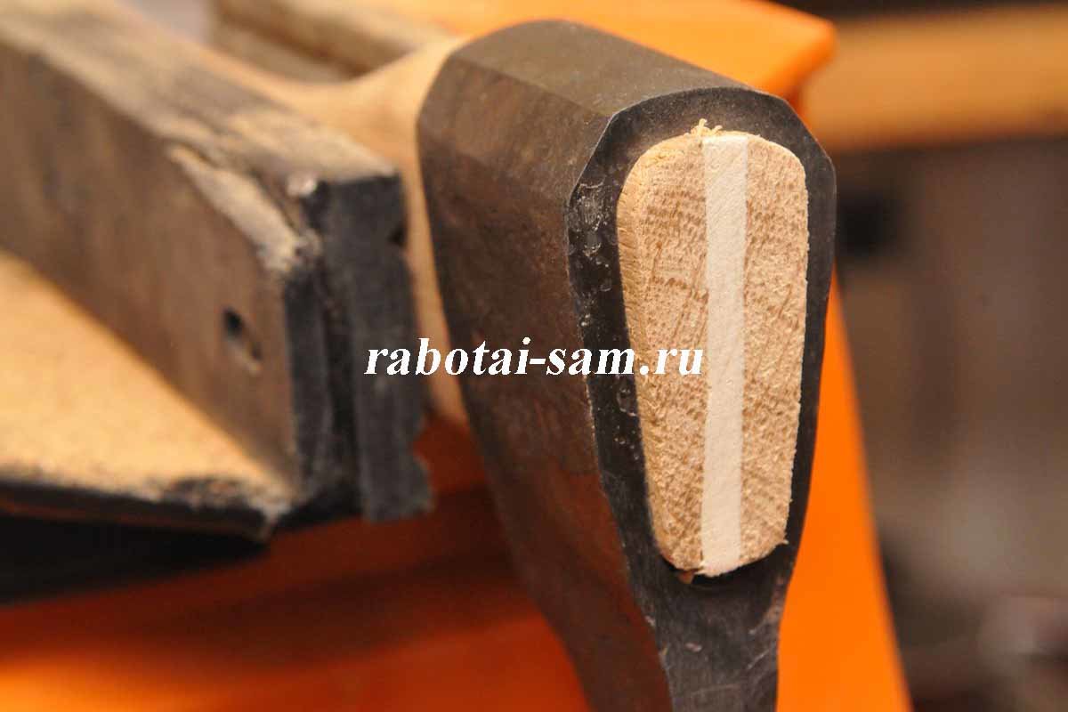 Металлическую часть насаживают на обух рукояти таким образом, чтобы над головкой топорище выходило на полтора сантиметра. Добившись плотной посадки, головку снимают и делают несколько распилов в обухе, не доходя до глубины посадки на 5 миллиметров: один распил продольный и два поперечных.