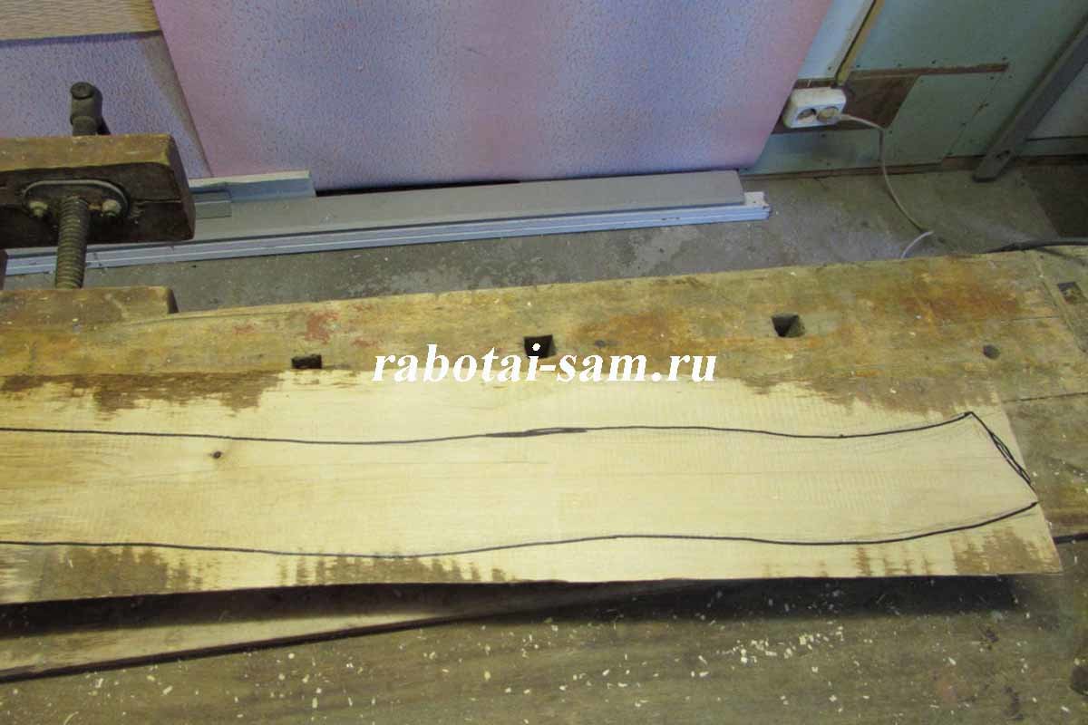 Подготовленный заранее шаблон с учетом всех основных норм укладывают поверх заготовленного куска древесины, а после обводят карандашом. Размеры бруска по общей длине должны превышать будущую рукоять на 10 см. Со стороны головки оставляют около 10 мм, а от края ручки 90 мм. Это необходимо, чтобы новое топорище не раскололось при насаживании обуха. По завершении всех работ припуски снимают.