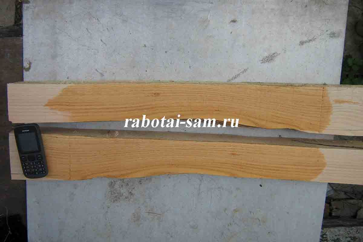 Из бруска, который прошел сушку, вытесывают брусок. Работу необходимо проводить вдоль волокон. Размер бруска должен быть на 100 мм больше чем размер готового изделия. Размер той части, куда, будет установлена, а само лезвие должна на 2 – 3 мм превышать размер проушины.