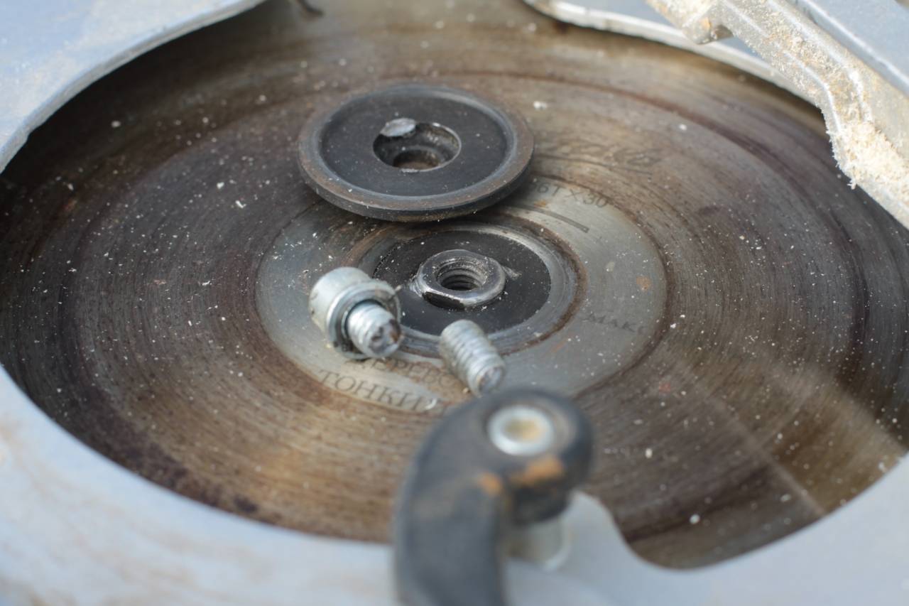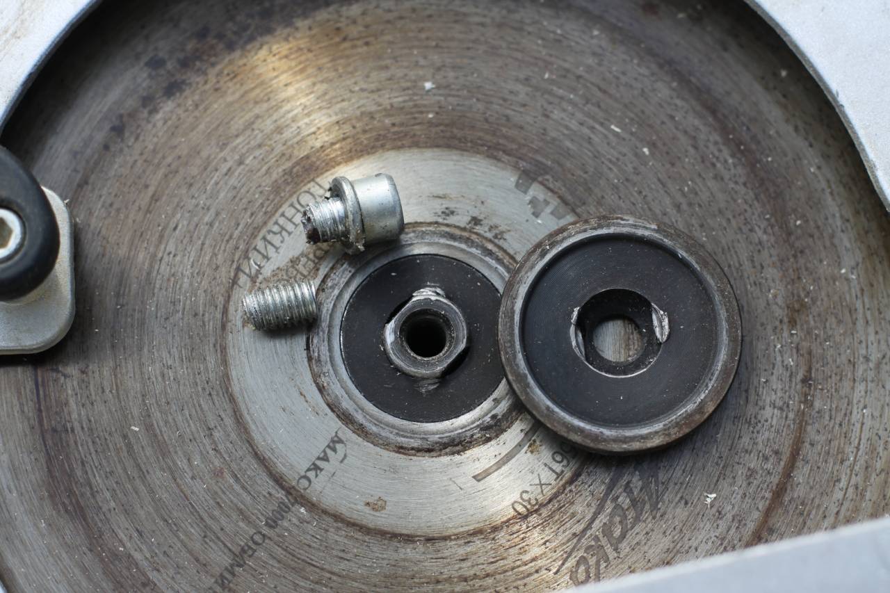 Почему срезало? А я скажу. Как устроен узел крепления диска? Диск надевается центральным отверстием на центрирующую шайбу на валу, а прижимная шайба надевается на конец этого вала который меньше по диаметру и имеет две лыски. Шайба, соответственно, имеет два ответных выступа цепляющихся за эти лыски. Все эти финты нужны для того чтобы при проворачивании диска не проворачивалась прижимная шайба и не затягивала болт больше необходимого. Здесь же участок вала с лысками слишком короткий и шайба цепляется самым краешком, это при том что стоит диск тоньше стандартного. Второе, шайба изготовлена, опять же, из ГОВНА и выступы под лыски просто смяло, это подтверждается тем что на валу никаких повреждений нет. А дальше просто, диск при пилении стремится провернуться, проворачивает прижимную шайбу. Этим бы всё и ограничилось, если б не заботливо подложенная под болт шайба гровера. Поэтому шайба не просто проворачивалась, она затягивала прижимной болт, пока тот не срезало. Болт, кстати, тоже из неподдающегося классификации говна, а не из нормальной стали, как это можно было бы ожидать в столь ответственном узле.