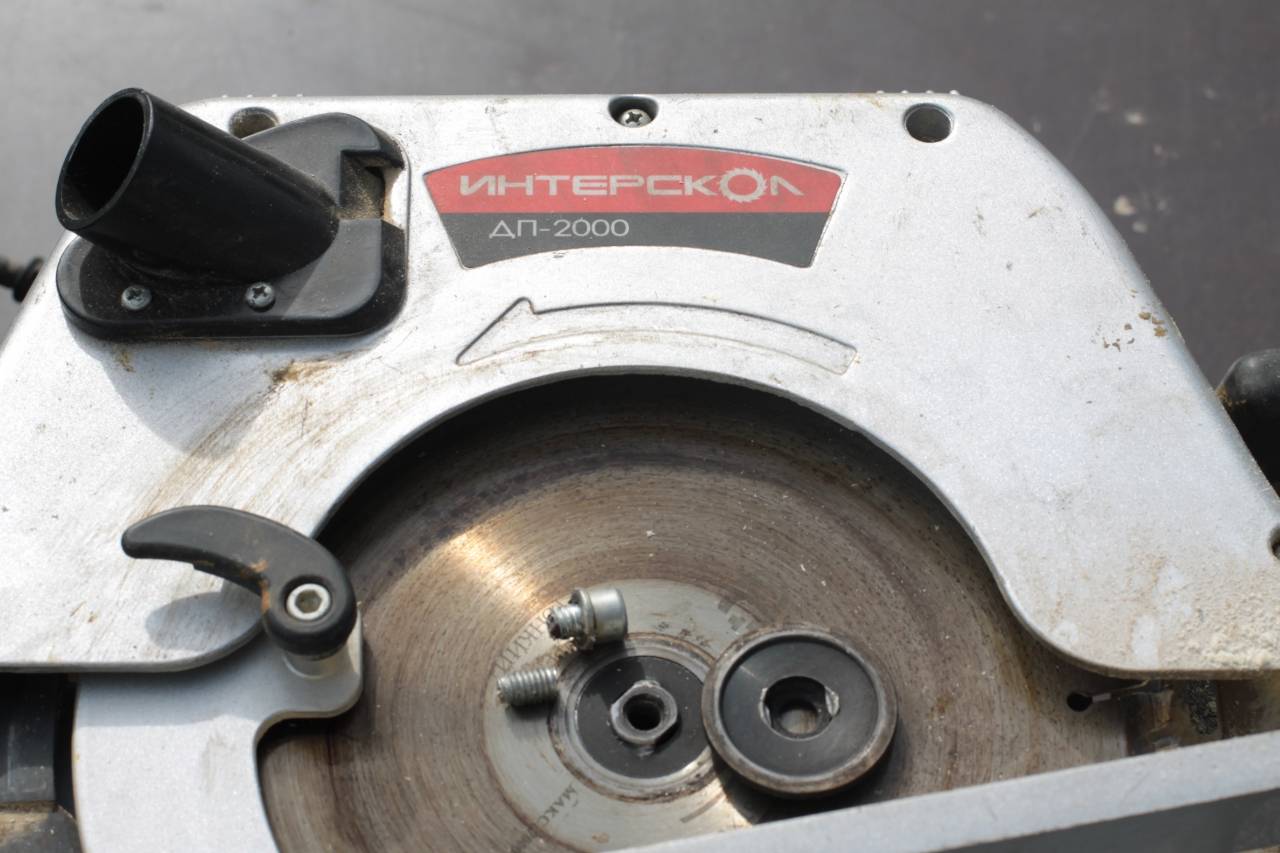 Как видно на фото, срезало болт крепления диска ручной циркулярной пилы «Интерскол ДП-2000». Срезало прямо в момент пиления, когда защитный кожух поднят. В результате сюрикен, диаметром миллиметров триста и весом с полкило отправился полетать. От последствий спасло только то что рядом никого не стояло, а также хорошая реакция и необычайное везение.