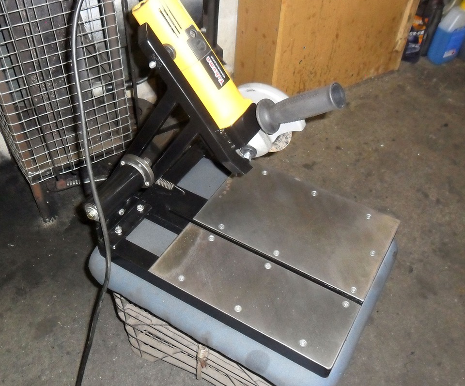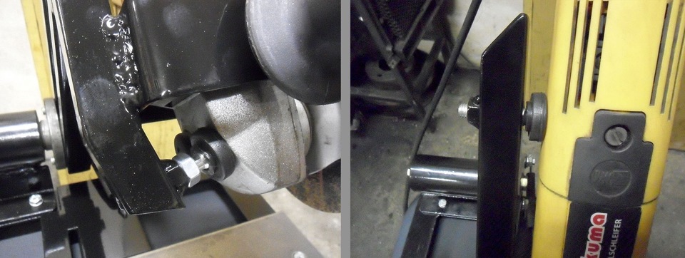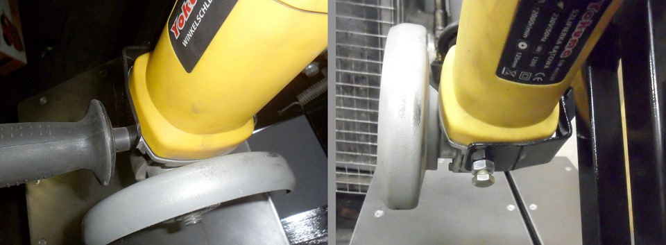 Как видно из фотографий крепление болгарки у каждого индивидуально, но самое главное, что в каждом из них инструмент крепиться надежно. На первом снимке инструмент вставляется в каркас и фиксируется болтами в местах крепления рукоятки.