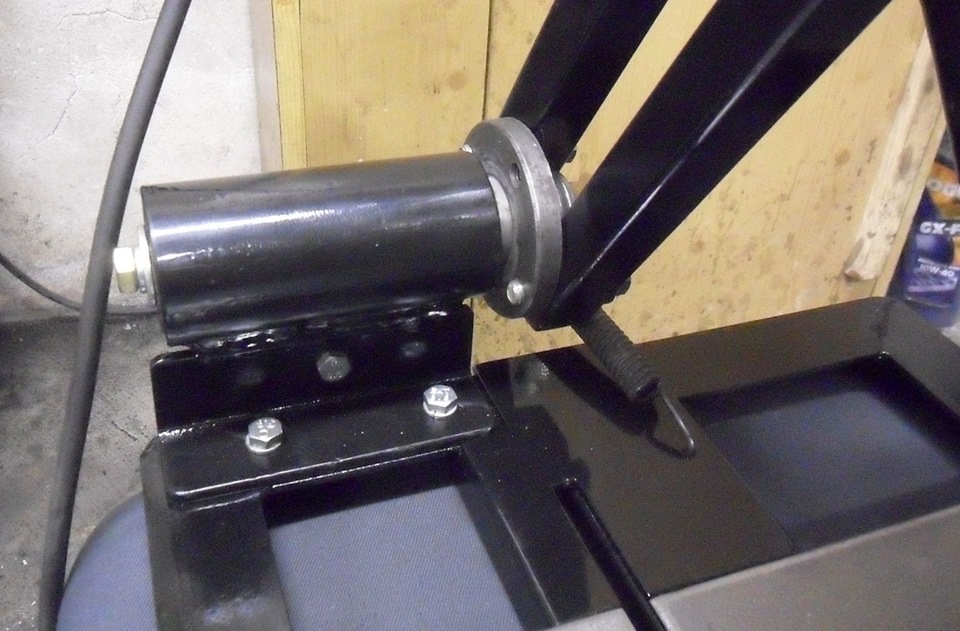 Сварку конструкции следует производить полуавтоматом. Высота шва при этом минимальна, и нет необходимости в дальнейшей зачистке. Для облегчения хода механизм собирается на подшипниках. При этом исключается люфт и заклинивание. Высоту подъема болгарки ограничивает поперечина и шпилька. Откручивая гайку, амортизаторы поднимают механизм кверху. Это обеспечивает использование ушм разных моделей.