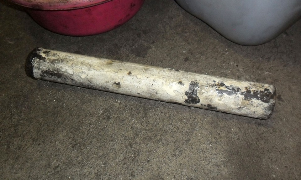 - Когда стойка хорошо приклеится к основанию, отступив от верхней части трубы 100 мм, сверлят сквозное отверстие диаметром 8 мм параллельно короткой стороне.