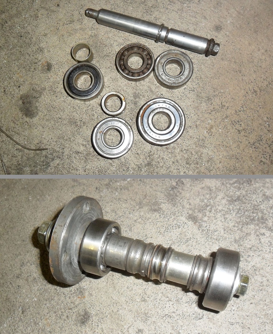 Нашел старый вал и фланец от волговской помпы и несколько подшипников, в том числе и убитых.Собрал такой бутерброд, чтобы максимально раздвинуть подшипники между собой: