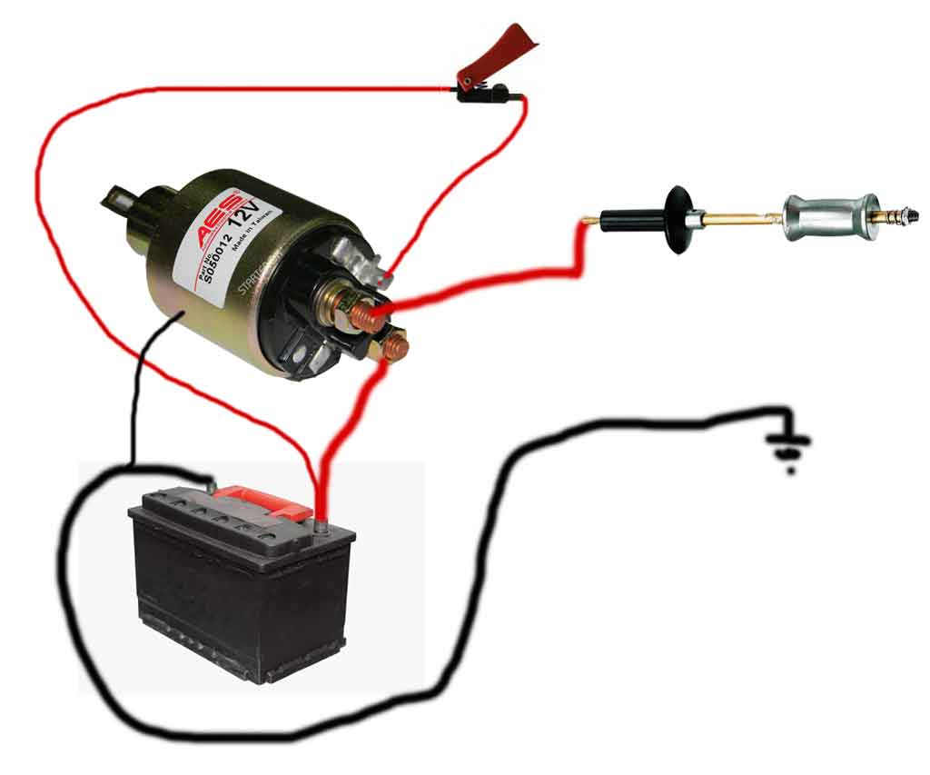 Кнопка подключается в цепь, которая соединяет плюсовой контакт аккумулятора с управляющим контактом втягивающего реле. Для информации: в автомобиле такой контакт соединен с замком зажигания