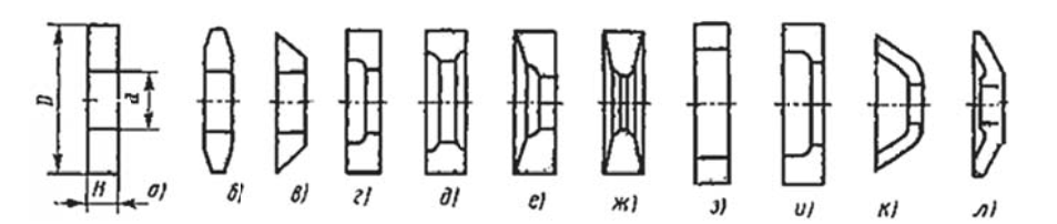 Рис 16. Профили шлифовальных кругов: а — прямой (ПП), б и в — конический (2П, 3П), г, д, е, ж — с выточкой (соответственно ПВ, ПВК, ПВД, ПВДК), з — кольцевой (К), и, к — чашечный (ЧЦ и ЧК), л — тарельчатый (Т), D и d — наружный и внутренний диаметр круга, H — высота