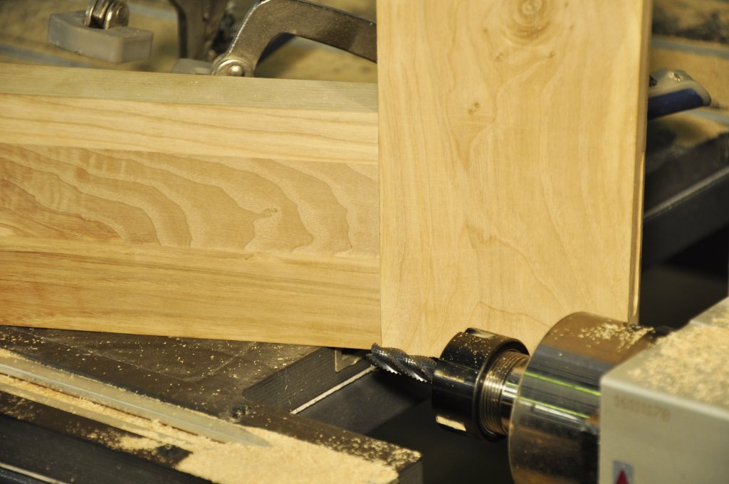 Затем начинается формирование элементов зацепления для будущего соединения (проушин и шипов). Для удержания детали во время обработки используются жёсткие прижимы.